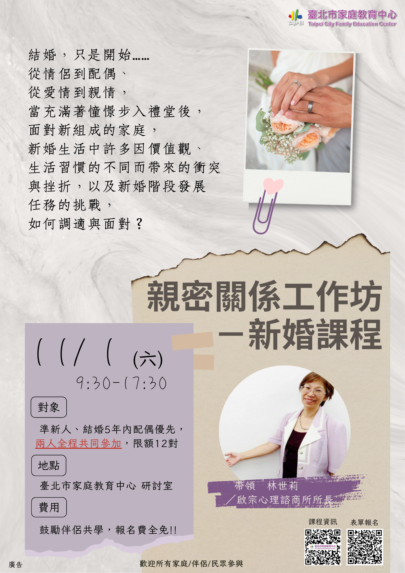(三)地點:臺北市家庭教育中心研討室。 (四)報名:即日起至114年10月28日止,額滿採候補報名登記 制,相關內容可於本中心網站課程與活動瀏覽、下載。